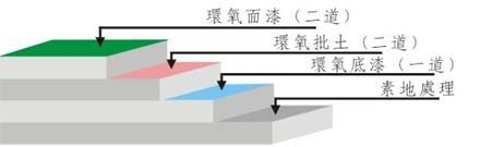 ③ 環(huán)氧底漆:采用滲透性及附著力特強環(huán)氧底漆滾涂一道,增強表面附著力;